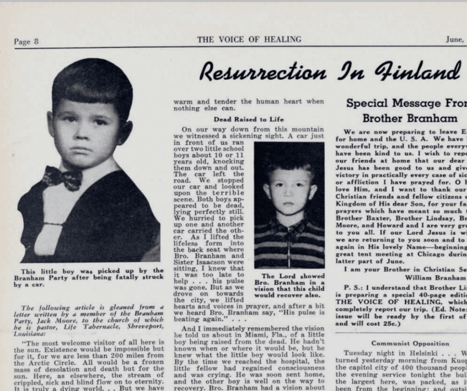 Ao longo de sua trajetória, William Branham foi se afastando gradualmente do propósito inicial de seu ministério — o de cura divina — para adotar um discurso cada vez mais apocalíptico e sensacionalista. Passou a sustentar profecias grandiosas sobre o fim do mundo e a incutir em seus seguidores a ideia de que eram um grupo especial, destinado a uma salvação mais gloriosa que a dos demais. Segundo ele, apenas aqueles que o seguissem fielmente seriam escolhidos para o arrebatamento. Nesse processo, apresentou diversas “revelações” que, na realidade, eram adaptações ou plágios de teólogos e pastores anteriores. E, por fim, não foi apenas em seu ministério que Branham criou narrativas questionáveis — ele também construiu mitos sobre a própria vida.
