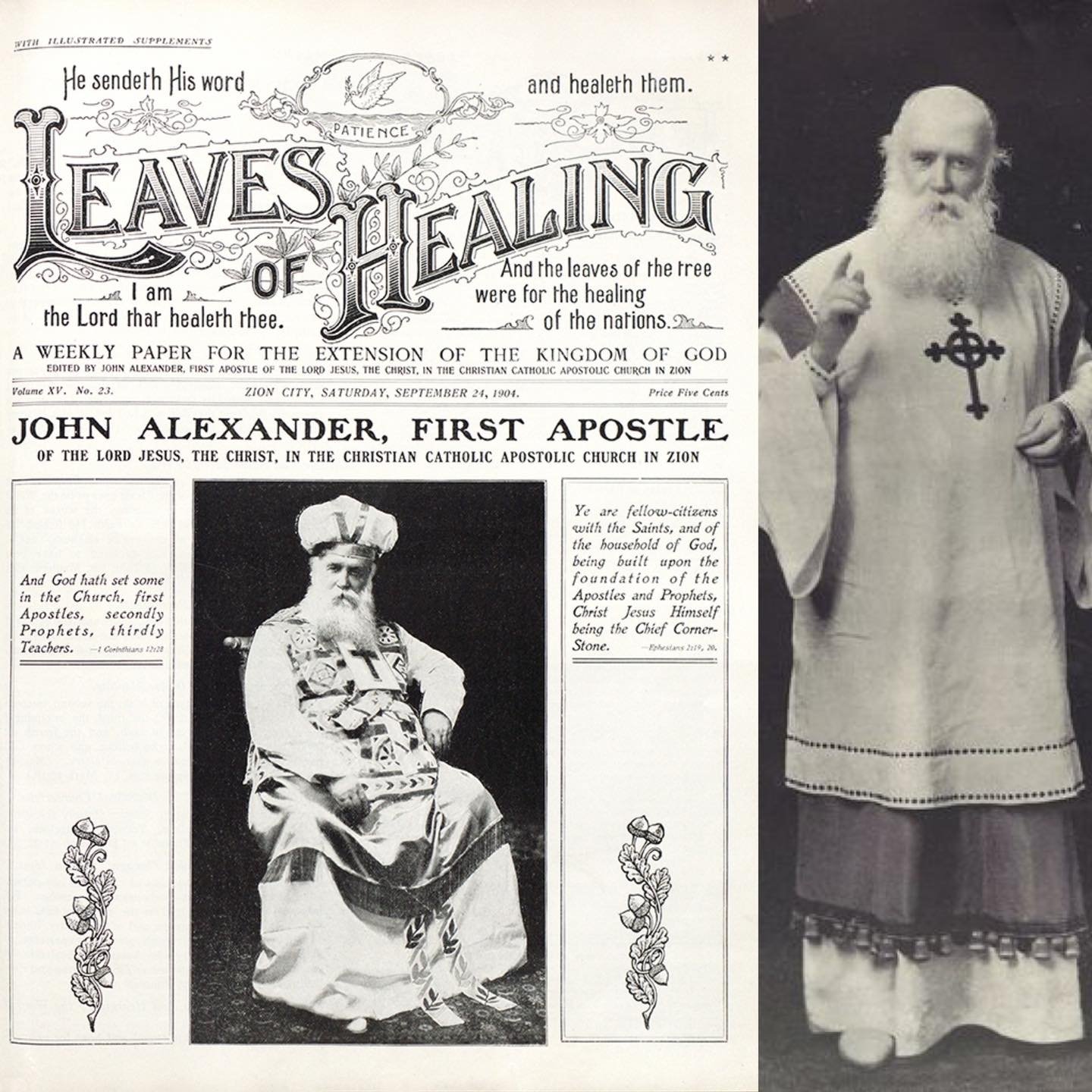- John Alexander Dowie, que reforçava a imagem profética usando manto e cajado,