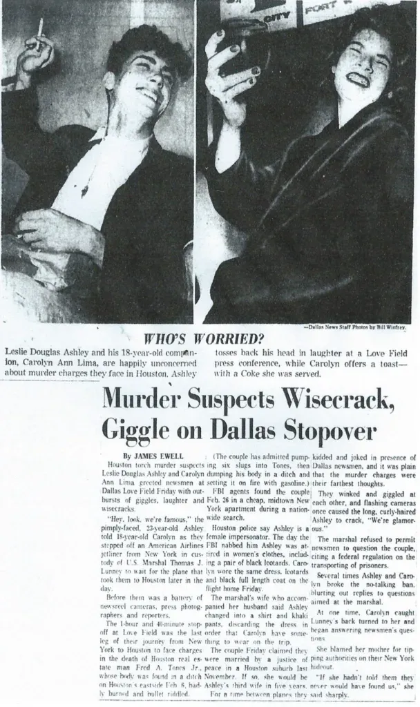 Leslie Douglas Ashley era enteado de James Ayers e sobrinho de Ted Kipperman , os dois fotógrafos que capturaram a icônica fotografia de Houston de William Branham , também conhecida como "a foto da coluna de fogo". Junto com Carolyn Lima trabalhando como prostituta, Ashley se envolveu em uma orgia a três com o magnata imobiliário Fred Tones. Durante o encontro sexual, Tones foi baleado e morto. Ashley e Lima foram julgados e condenados por assassinato no tribunal estadual do Texas e enfrentavam a pena de morte .