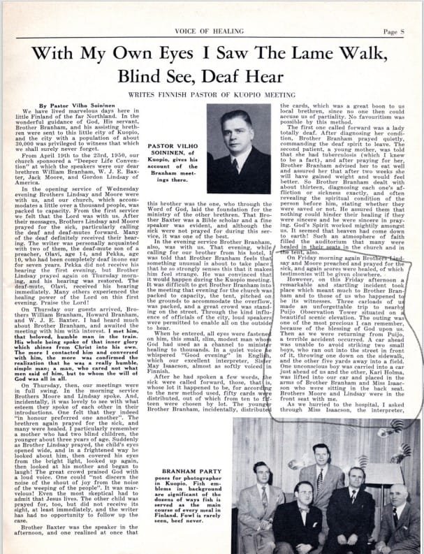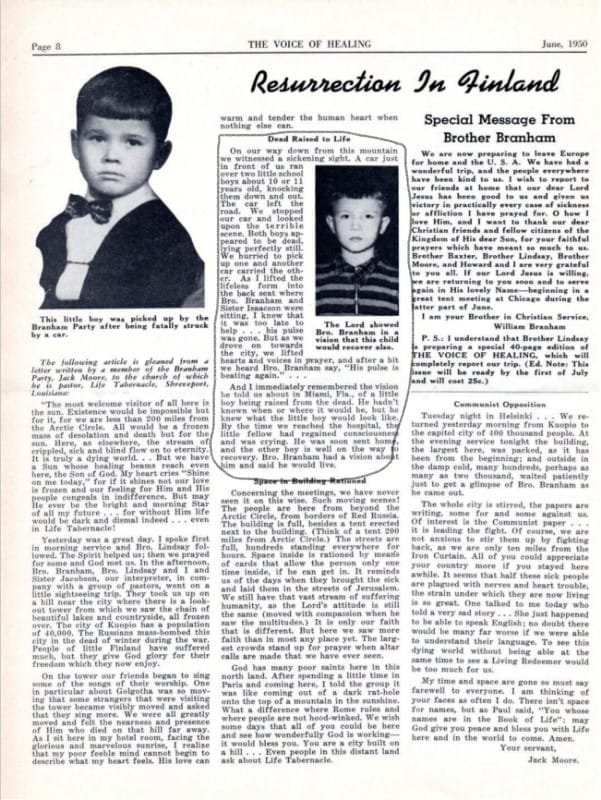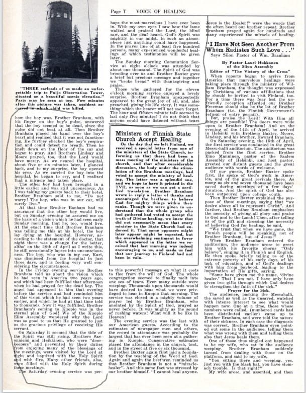 Na revista Voz da Cura, Especial da Escandinávia em 1950, conta sobre a viajem de William Branham e os milagres ocorridos, bem como, o Milagre do garoto da Finlândia, na página M, temos o testemunho do próprio William Branham.