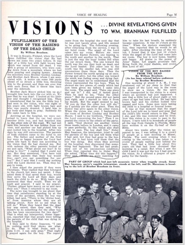 Em nosso caminho descendo desta montanha, testemunhamos uma visão repugnante. Um carro bem na nossa frente atropelou dois garotinhos, cerca de 10 ou 11 anos, os deixando inconscientes. O carro saiu da estrada. Paramos o carro e olhamos para a cena terrível. Os dois garotos pareciam estar mortos, deitados perfeitamente imóveis. Corremos para pegar um e outro carro carregou o outro. Quando levantei o corpo sem vida para o banco de trás onde o irmão Branham e a irmã Isaacson estavam sentados, eu sabia que era tarde demais para ajudar… seu pulso havia sumido. Mas enquanto dirigíamos em direção à cidade, elevamos corações e vozes em oração, e depois de um tempo ouvimos o irmão Branham dizer: "Seu pulso está batendo novamente."