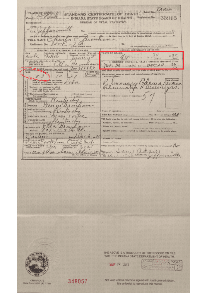 Com base em artigos de jornal e na Certidão de Óbito de Charles Branham, ele tinha 53 anos quando faleceu, após enfrentar uma doença por 10 meses e William Branham não era criança, e muito menos solteiro.