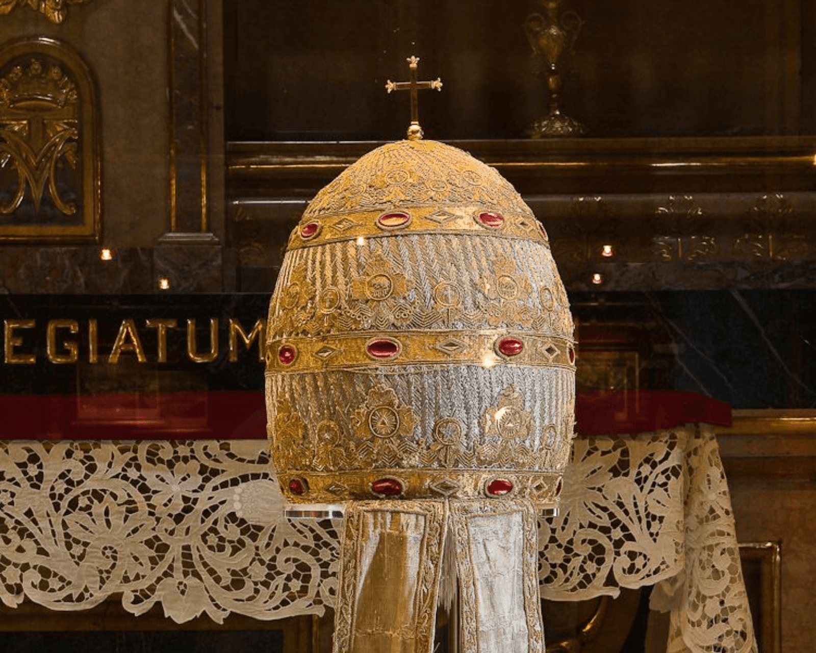 A primeira menção foi em 1914, e a segunda no ano seguinte. Porém, existe uma terceira citação que nega qualquer tipo de inscrição na coroa do pontífice romano. E não há qualquer tipo de evidência que prove o contrário.